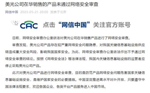 5月21日晚,国家网信办官方发布通告,美光公司在华销售的产品,未通过网络安全审查。
