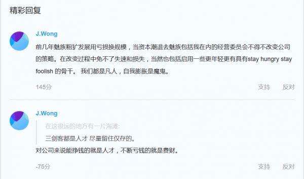 在此回复之前的十几分钟,黄章还在帖子下发评论称:“前几年魅族粗犷发展用亏损换规模,当资本潮退去魅族包括我在内的经营委员会不得不改变公司的策略。在改变过程中免不了失速和损失,当然也包括起用一些更年轻更有具stay hungry stay foolish (虚心若渴,求知若愚——编者注)的骨干。我们都是凡人,自我膨胀是魔鬼。”