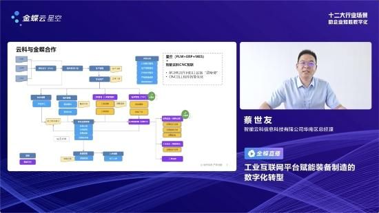智能云科信息科技有限公司专注于机器加工领域的工业互联网平台,是工信部工业互联网产业联盟理事单位,是金蝶的ISV伙伴。智能云科华南区总经理蔡世友分享到,云科与金蝶的合作,基于制造企业生产现场的设备,如CNC设备、仪器仪表类设备、PLC类设备、机器人等设备,通过数据采集至智能云科物联平台,以刀具监控、智能增效设备监控等相关的APP呈现,以设备监控、数字孪生等监控与分析,并通过数据接口与金蝶云·星空进行数据对接。
