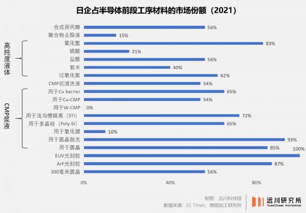 而日本公司对半导体材料近乎垄断的地位更是威名在外:前段工序常用的材料有19种,其中14种都由日本企业主导。