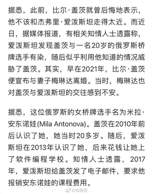 #盖茨再爆与年轻俄国女孩婚外情# 又被曝光!微软比尔·盖茨被曝曾和20岁俄国女孩有婚外情……人设塌的很彻底[摊手]#盖茨再爆婚外情#