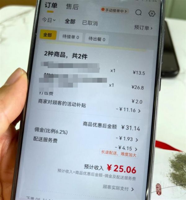 “不买流量,不刷单,店铺怎么做得起来?”在致电“12345”的反映中,吴先生称外卖市场的恶性竞争让创业者不堪重负。他曾算过一笔账,目前两家外卖平台的抽佣和商家支付的配送费,一般要占到每单的20%。后台显示,消费者点了一单31元的外卖,他最终只能收入25元。再算上每天买流量和刷单的成本,如果他的店铺每天做不到100单以上的订单量,则很难回本。但目前店铺的订单量距离这个目标还有距离。