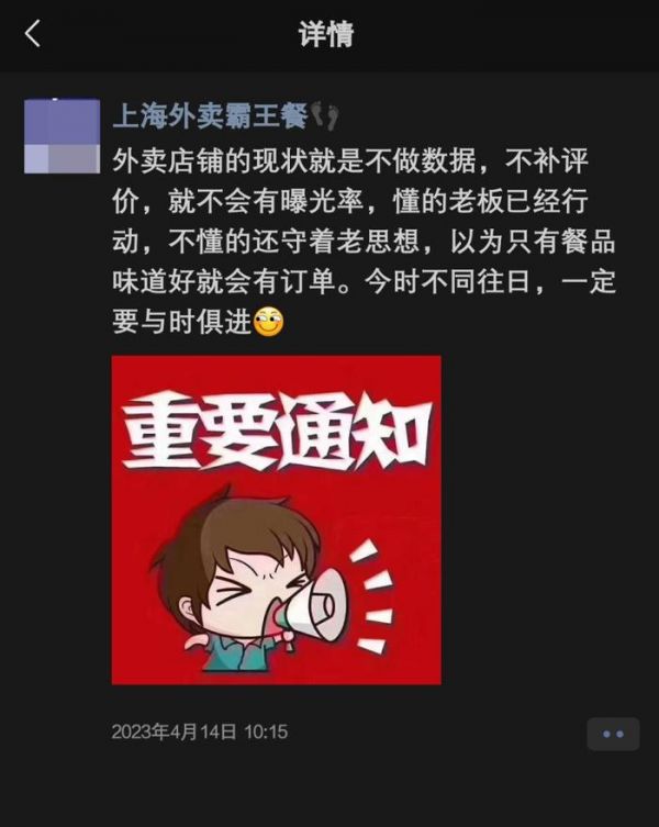 记者进而联系上一名“霸王用餐”App的业务员,他声称刷单一方面可以提升店铺的评分,使店铺成为“优质商家”,带来平台的推流,同时补充的大量正面评价也会吸引更多用户下单,“一举多得”。“外卖的现状就是这样,不做数据,不补评价,就不会有曝光率”,他的朋友圈不断刷新着这些鼓动性话语。