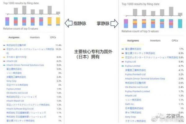 1、专利挑战:在静脉识别技术领域,日本企业布局较早,并已得到广泛应用。根据研究机构的数据显示,不论是在指静脉还是掌静脉领域,专利排名前20企业基本都是日本的企业。