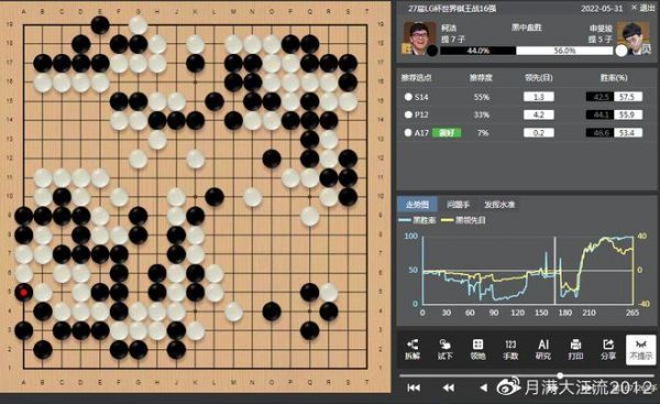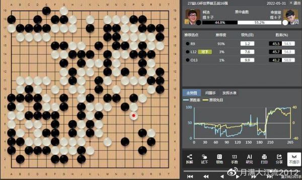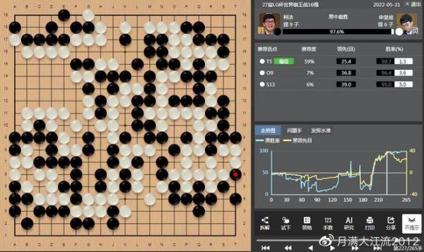 5月31日结束的第27届LG杯16强战柯洁VS申旻埈的比赛中,柯洁在开局就进入了接龙的绝境,这是谁都没有想到的。但柯洁在绝境中精彩逆转战胜了申旻埈复仇成功,令所有的围棋吃瓜群众大呼过瘾。有评论说柯洁选择了一个弹窗最多的赢棋方式,选择了一个最吊观众胃口的赢棋方式。大家为什么会这样一致地如此认为?就是因为在AI之下,所有的观战者都能通过AI的胜率来时刻知道对局的实际胜负情况,比对弈的棋手双方还清楚。