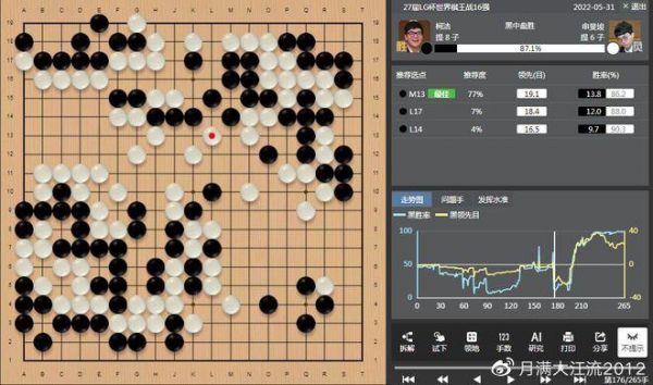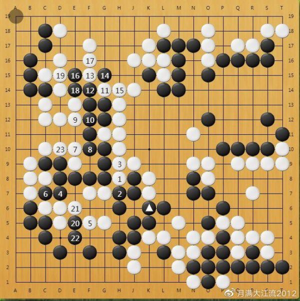 柯洁在白棋空中搅出了棋杀掉一块白棋后,观众可能会以为柯洁逆转了。但实际柯洁形势依然落后,差距很微弱,1目上下的样子。如果没有AI,即便是职业棋手也是极难看明白的。