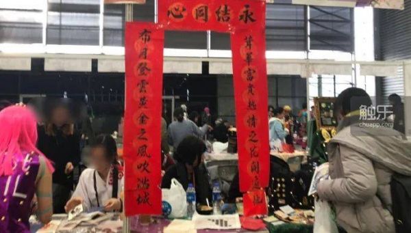 同人展会上的对联大多继承了这种“直说大白话”的特质。对喜爱某一角色配对的创作者而言,往往会用一副工整的对联讲述自己的配对有多恩爱,最后加上“永结同心”或是“喜结连理”的横批。大多数时候,同人对联上的遣词造句不十分讲究,词性能对上已经是算是尽了最大的努力,至于平仄等更高级的要求总是会被抛到九霄云外。
