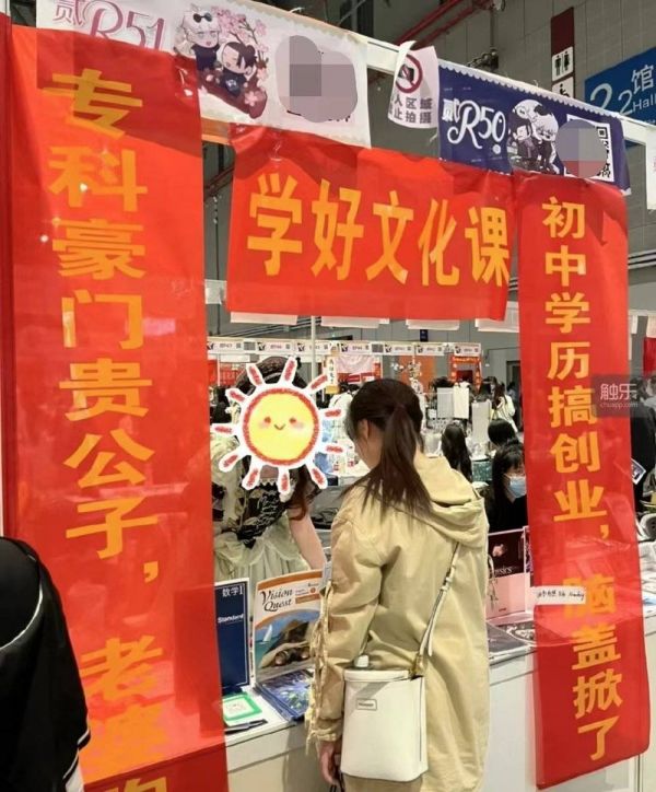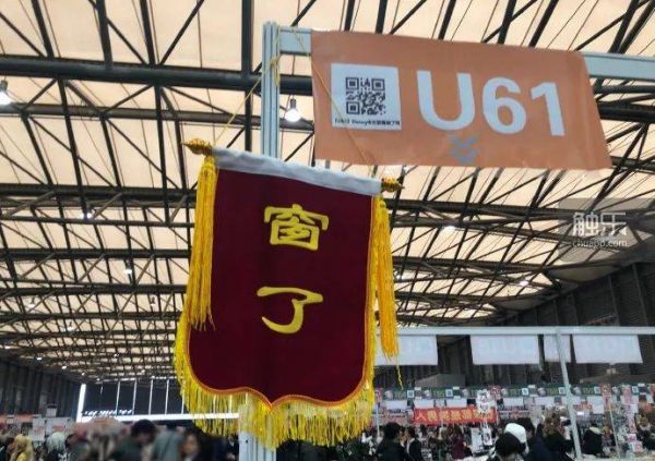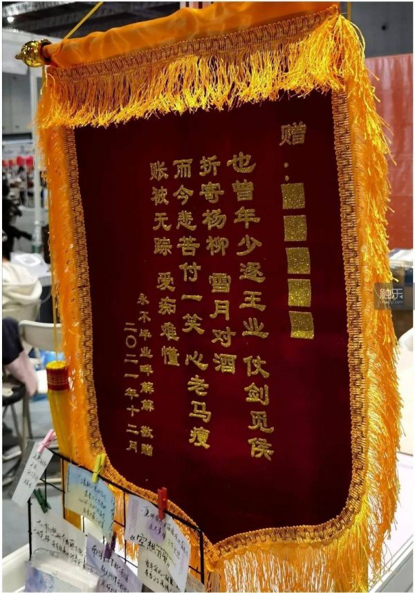 此刻,摊位的宣传还是以海报为主,这幅远处的锦旗显得独树一帜