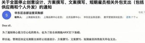知名公关及广告服务商蓝色光标打响了用AI优化人员配置的第一枪。4月12日,蓝色光标内部邮件截图被爆出,为了“给全面拥抱AIGC打下基础”,蓝色光标决定无限期全面停止创意设计、方案撰写、文案撰写、短期雇员四类相关外包支出。对此,蓝色光标方回应媒体称,相关邮件内容属实。