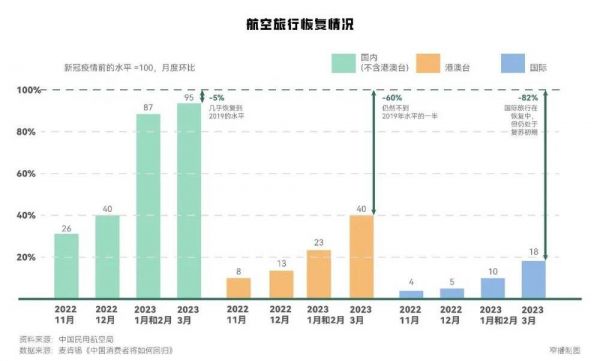 随着出境游重启、航班的有序恢复,国内消费者的外出意愿高涨。据麦肯锡,3月份内地航空旅行几乎恢复到疫情暴发前的水平,航班数量已达到2019年同期的95%。与之相比,港澳台、国际旅游还有较大的恢复空间,航班数量仍不及2019年同期的一半。