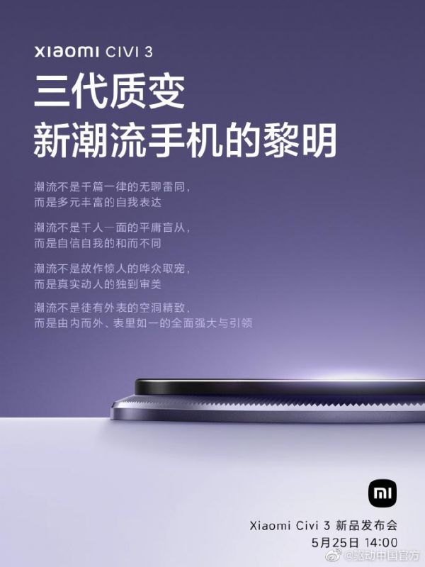 【#小米Civi3# 定档5月25日正式发布:首发天玑8200 Ultra】