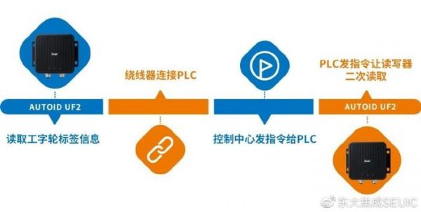 概述:该产线RFID的应用主要集中于绕线环节完成后的下线环节,钢丝帘线被绕到贴有RFID标签的工字轮上后,通过东集AUTOID UF2读取标签信息,通过与PLC(可编程逻辑控制器)的连接,完成信息录入。