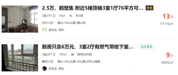 而在另一个知名线上房屋交易平台里,新周刊记者检索发现,鹤山区的在售二手房仅有2套,均位于中心区域,其中一套3室1厅1卫、总计76平米的住宅售价13万元,另一套3室2厅1卫带地下室、总计105平米的住宅开价9万元,难觅单价一两万的“白菜房”。