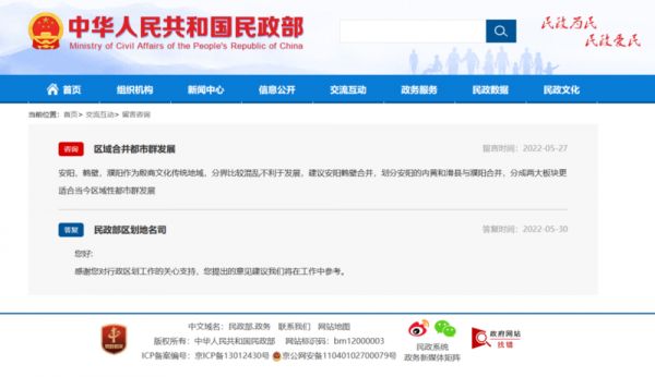 去年更有网友在民政部官网留言,建议安阳、鹤壁两市合并以促进区域性都市群发展。(图/民政部留言板)