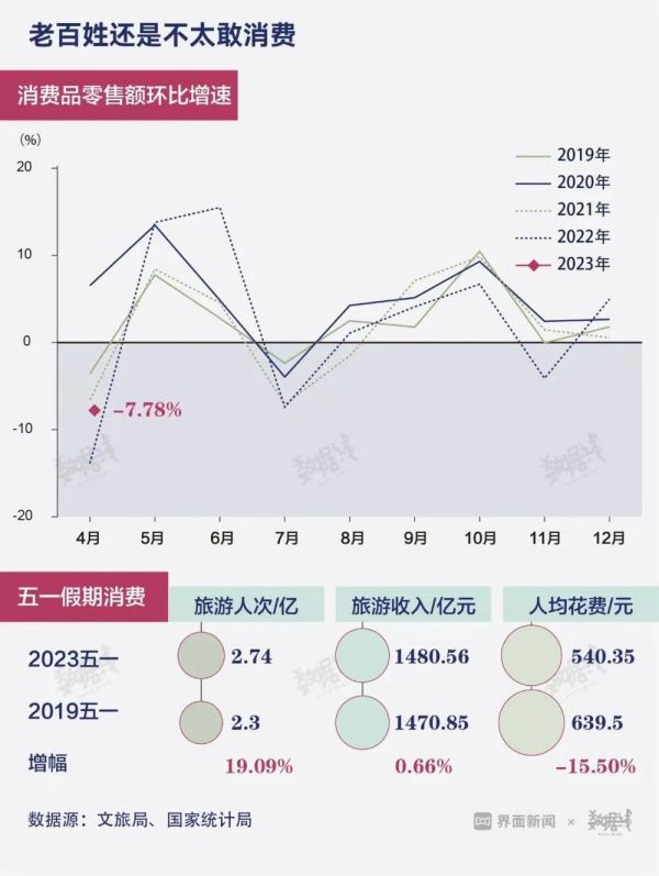 4月社会消费品零售额近4亿元,单月同比增长18.4%,但环比下降了7.78%,是近几年除2022年以来跌幅最大的一次。五一假期往往会刺激消费,而刚过去的五一假期人均旅游花费仅恢复至2019年的84.5%。