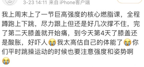 而在网上抱怨运动伤膝盖的人,大多也都有类似的经历:一上来就连跳半个月高强度团操,或者突然怒跑十几公里。
