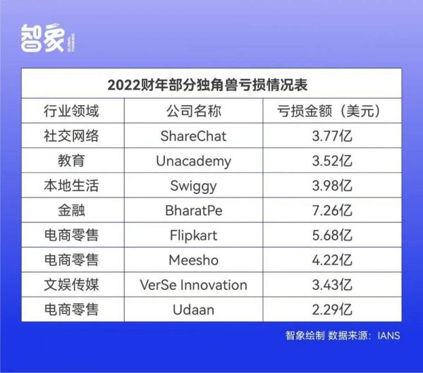 除了Byju's在大额亏损,大部分印度独角兽都面临盈利难的困境。据印媒统计,2021~2022财年,至少有55家独角兽亏损,累积亏损额高达59亿美元。