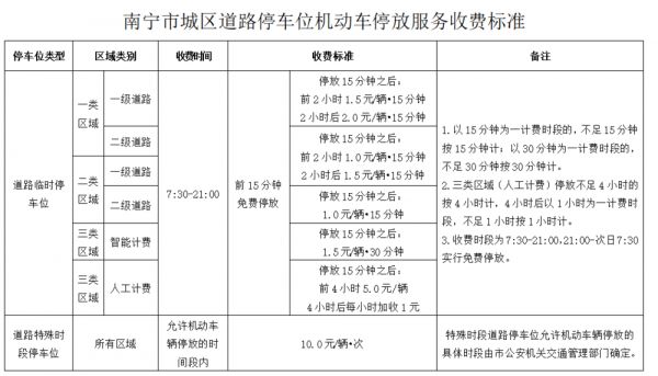 南宁市道路临时停车位收费时段为7:30-21:00,其余时段免费开放。收费时段中,前15分钟免费,之后按照不同的区域级别实行不同的收费标准,折算后每小时3-8元不等。按照该标准计算,如果在南宁市一类区域一级道路临时停车位停车一天,将被收取102元的停车费。