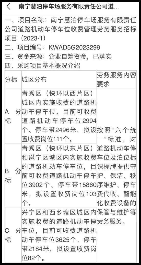 以今年4月20日的劳务项目招标公告为例,当时慧泊停车对10521个停车位及20540米的停车带相关服务招标,拟设置296个收费岗位,服务内容是对停车位进行秩序维护、停车费代收、智能收费设备维护等。