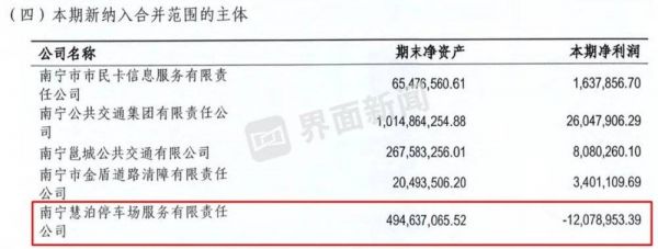 目前慧泊停车是南宁轨道交通集团的二级子公司,界面新闻记者从南宁轨道交通集团的财报中查到慧泊停车的部分财务数据。慧泊停车截至2022年底的净资产为4.95亿元,2022年净利润亏损1208万元,但财报未解释具体的亏损原因。