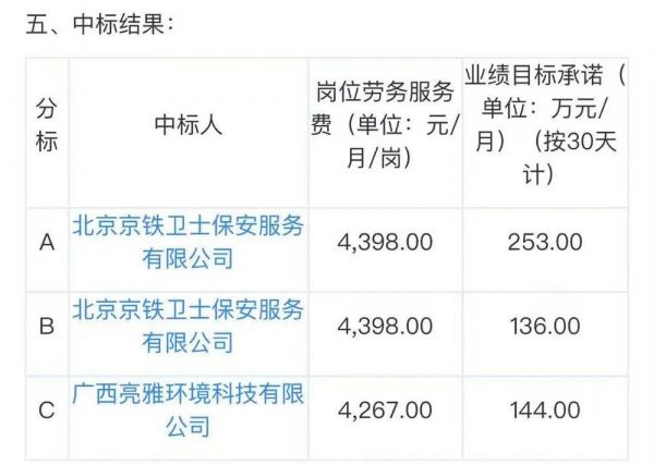 5月11日的中标公告显示,北京京铁卫士保安服务有限公司和广西亮雅环境科技有限公司中标,每个收费岗位的劳务服务费为4267~4398元,并承诺了533万元的月度业绩目标。
