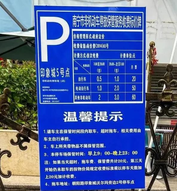 南宁市兴宁区某社区服务中心经营的非机动车停车场收费标准显示,非机动车停车按次收费,7:00至20:00自行车收费0.5元/次,电动自行车收费1元/次;20:00至次日7:00自行车收费1.0元/次,电动自行车收费2.0元/次。自行车月票20元,电动自行车月票50元。