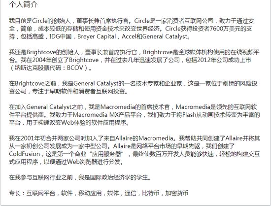 在创立Circle之前,杰里米·阿莱尔(Jeremy Allaire)就是一位连续创业者。其创立的一家在线视频平台Brightcove已经成功登陆美股纳斯达克(股票代码:BCOV)。Brightcove提供基于云的平台来发布和分发数字媒体。它提供Brightcove Video Cloud服务使客户能够向连接的互联网设备发布和分发视频。