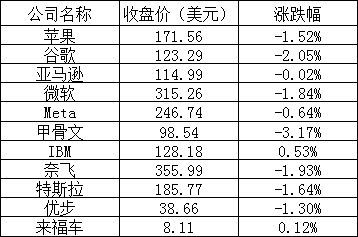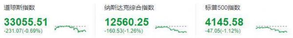 道琼斯指数收于33055.51点,下跌231.07点,跌幅0.69%;标准普尔500指数收于4145.58点,跌幅1.12%;纳斯达克指数收于12560.25点,跌幅1.26%。