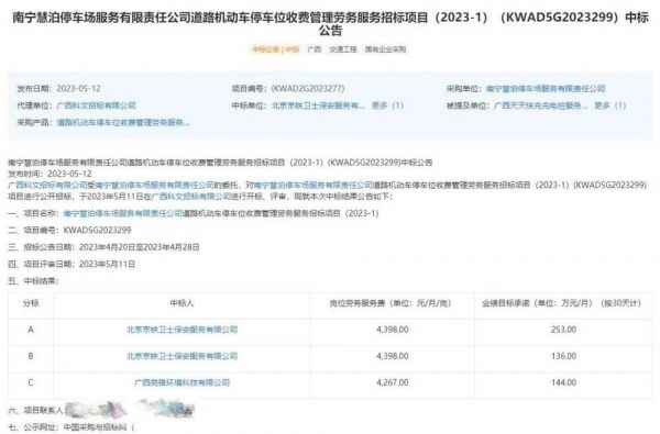 一则招标信息显示,就在上个月,慧泊公司将停车位收费管理的劳务服务公开招标,3家中标公司业绩目标承诺分别达253万元/月、136万元/月、144万元/月。