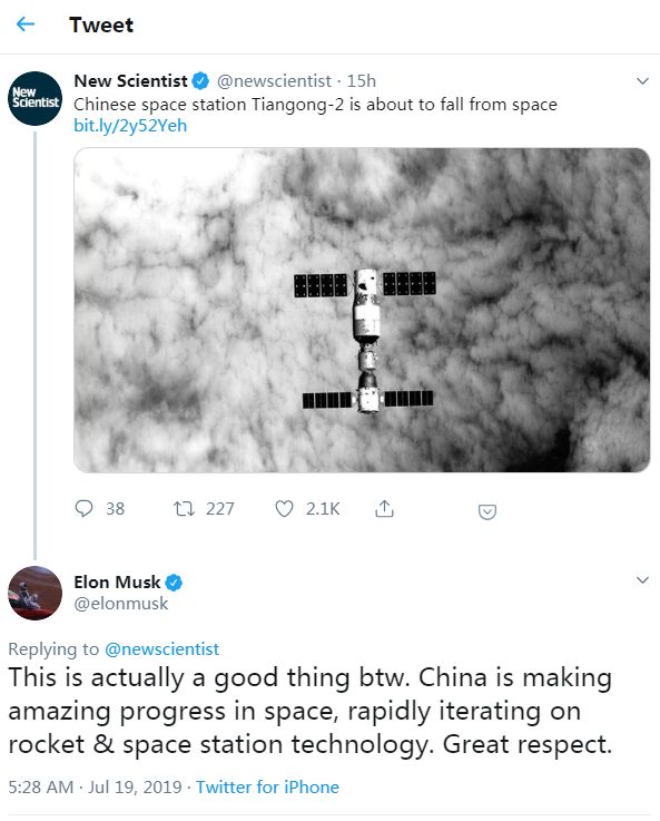 新浪科技讯 北京时间7月19日晚间消息,马斯克在微博上转发了中国天宫二号空间实验室再入大气层的消息,并对中国航天领域的进步表示敬意。