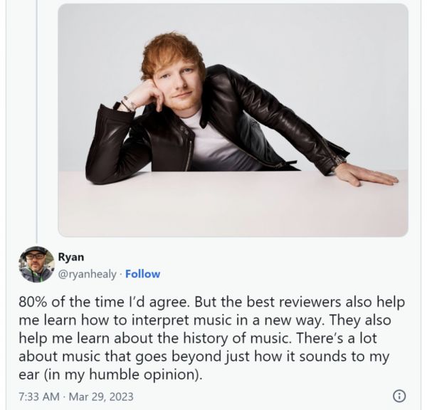 今年3月底,Ed Sherran也发言称乐评没有意义。在实体唱片时代,乐评人可以为唱片企划做深度诠释,为想要购买专辑的乐迷指导消费,而如今的乐评人能做些什么呢?