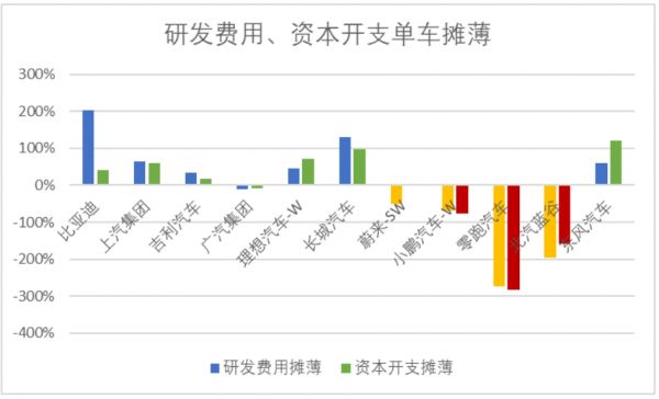 我们将车企2022年研发费用和资本开支一起纳入核算,如果将每万元资本开支和研发费用计入单车收入,我们会发现明显低于行业均线的依旧是蔚来、小鹏、零跑和北汽蓝谷。