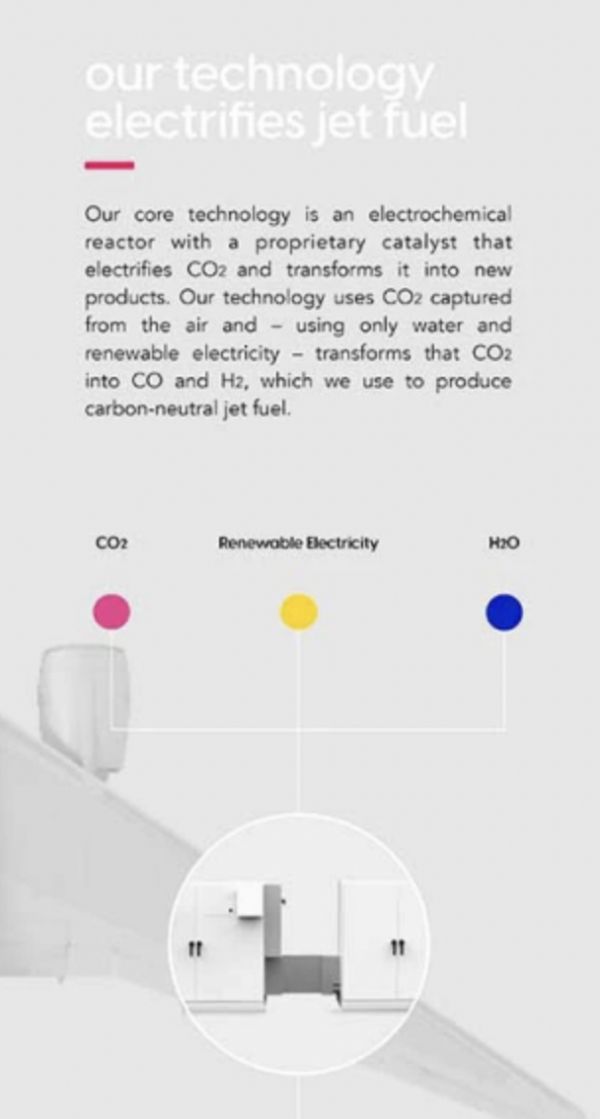 Twelve这家公司因为走了另一条路线获得了许多关注,他们的核心专利技术是叫做E-Jet®的零碳无化石喷气燃料,这一过程只需要二氧化碳、水和电作为原料,就可以通过化学反应器将二氧化碳转换成新产品,航空燃料便是重要应用之一。过去几年内,电力再生、二氧化碳捕捉和电解器等Twelve所需的技术成本都在降低,因此Twelve生产E-Jet®过程的成本也比目前其他SAF生成方式更便宜。