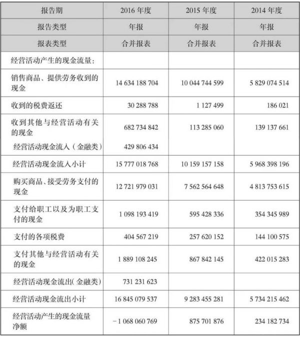 下面是乐视网2014~2016年度的现金流量表(货币单位:人民币元。资料来源:乐视网各相关年度财务报告):