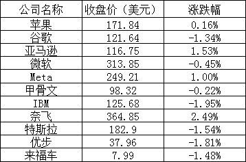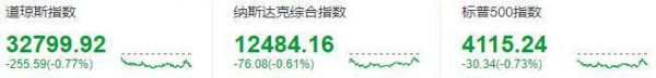 道琼斯指数收于32799.92点,下跌255.59点,跌幅0.77%;标准普尔500指数收于4115.24点,跌幅0.73%;纳斯达克指数收于12484.16点,跌幅0.61%。
