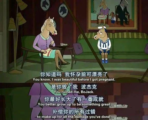 波杰克的原生家庭十分糟糕,刻薄的母亲总爱打击波杰克,出轨的父亲将婚姻失败的原因归罪于波杰克。(图/《马男波杰克》)