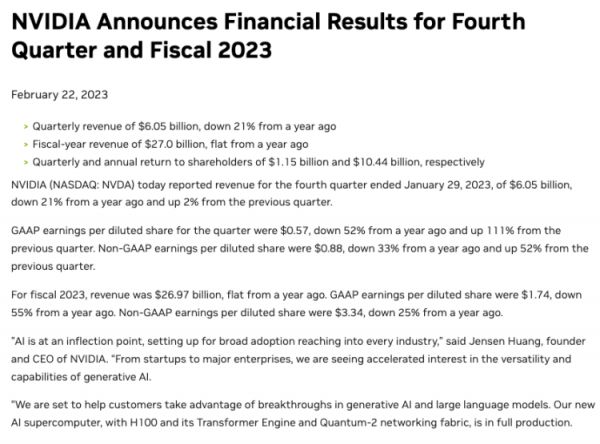 黄仁勋在财报中表示,“计算机行业正在同时经历两个转变——加速计算和生成人工智能。”他认为,随着公司竞相将生成人工智能应用到每个产品、服务和业务流程中,全球数据中心基础设施将从通用计算过渡到加速计算。