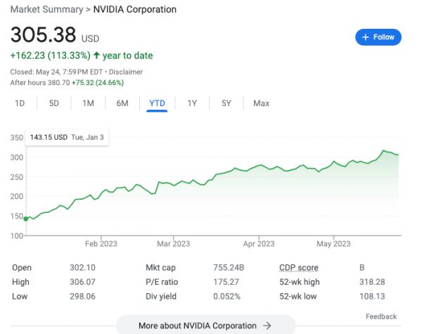 今年到目前为止,英伟达股价已翻了一倍以上。