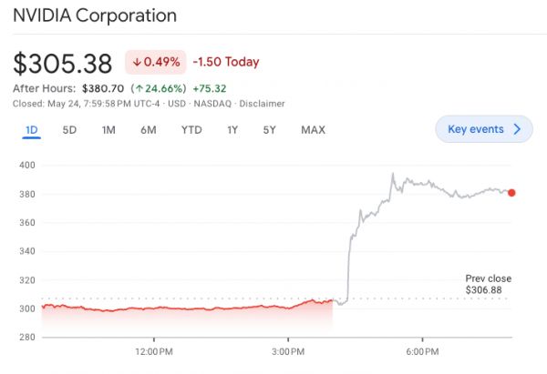 令市场目瞪口呆的亮眼数据引发了英伟达的股价暴涨。盘后股价一度高涨近30%创下历史新高,市值也增加了近3000亿美元。