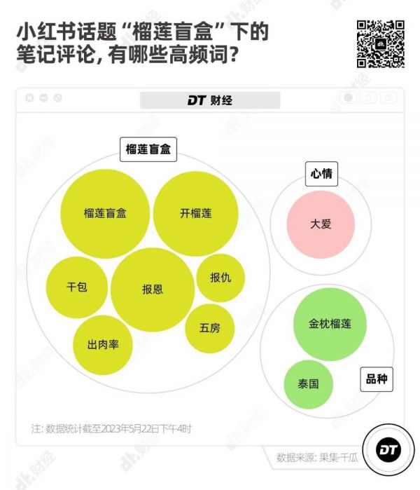 截至2023年5月22日,抖音话题 #徒手剥榴莲的惊喜# 播放量达到5.4亿,#又到了开榴莲盲盒的季节# 播放量达到4.3亿。小红书近一个月和“榴莲盲盒”有关笔记达到1.17万篇。