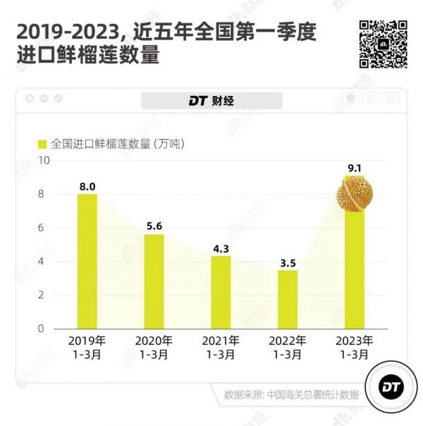 根据中国海关总署的数据,2023年第一季度全国进口鲜榴莲一共9.1万吨,是近五年同期进口数量最高的一年,甚至超过疫情爆发前的2019年。