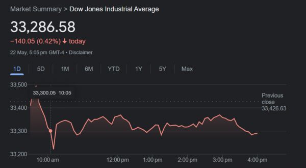 图:当地时间5月22日的美国道琼斯工业平均指数行情。在10点之后发生了小幅下跌。