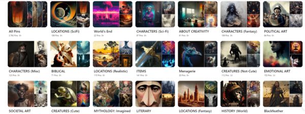 图:Pinterest上一位AI辅助创作者的作品目录。他把自己利用Midjourney生成出来的近百个主题(如“科幻场景”“通灵旅程”“政治画”“圣经风格”等)分门别类,整理成库。| 图片来源:Pinterest @Vellectrum