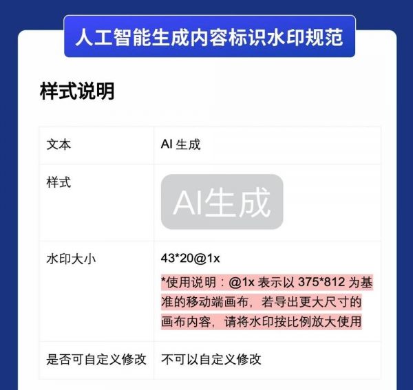 图:抖音规定的“AI生成”水印样式。图片截取自《抖音关于人工智能生成内容标识的水印与元数据规范》