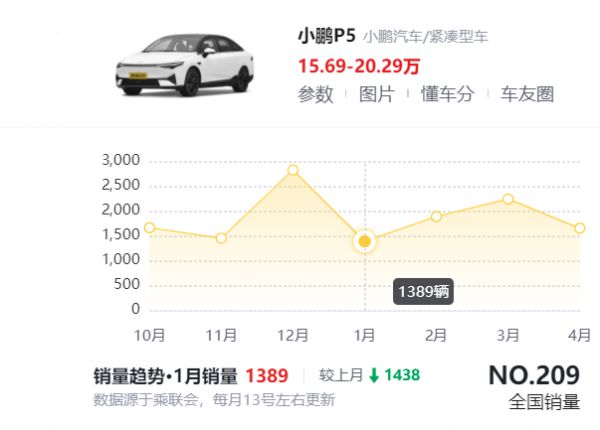 今年1月,小鹏P5官方价格体系调整,直降两万,起售价来到了15万级别。不过比起比亚迪秦、埃安这些畅销款,售价还是偏高,销量也持续低迷,最新月销量还不到2000台。