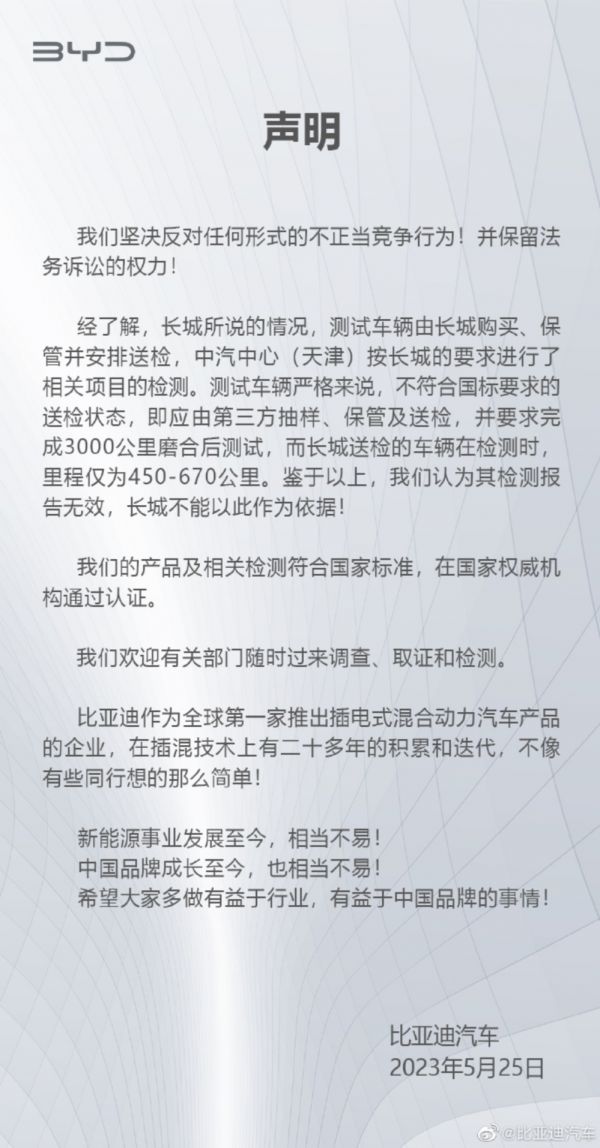 2023年5月25日上午10点40分,长城汽车在其官方微信公众号发布了一份《声明》,称其在4月11日就比亚迪秦PLUS DM-i、宋PLUS DM-i上由于采用了常压油箱,有整车蒸发污染物排放不达标的嫌疑,向主管部门进行了举报。