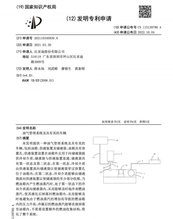 根据一份比亚迪股份有限公司提交的发明专利申请中,该公司提出了一项由油箱、供液装置和储液袋构成的油箱系统。根据介绍,这套系统能够将高温挥发后的燃油蒸汽冷却为液态,最终掉落回油箱内。在这其中,车辆无需使用高压油箱,系统得到了简化。