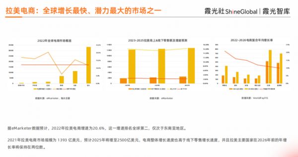 霞光智库基于相关行业数据和用户调查,从平台电商、消费者,以及产业链上下游等维度,对拉美电商市场的现状进行深入分析,拆解未来发展趋势与机遇,正式发布《2023年拉美电商市场研究报告》,希望能够为电商行业的参与者提供一些参考。
