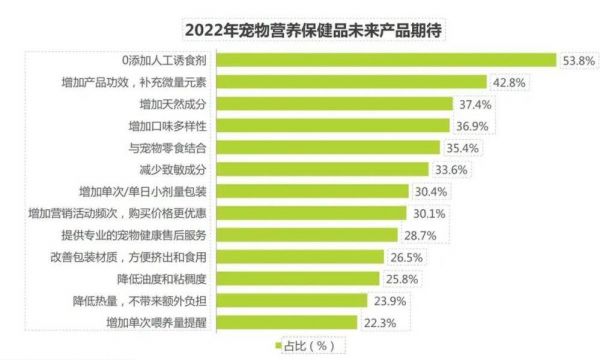 另外是宠物保健产品本身的丰富度和消费场景的多元化上的问题。从《中国宠物健康消费白皮书》中能够看到,2022年消费者对宠物保健品的期待,包括产品是否添加诱食剂、功能是否丰富、口味是否多样、成分是否天然等。