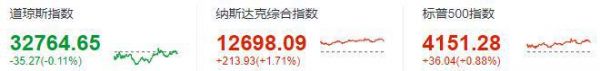 道琼斯指数收于32764.65点,下跌35.27点,跌幅0.11%;标准普尔500指数收于4151.28点,涨幅0.88%;纳斯达克指数收于12698.09点,上涨213.93点,涨幅1.71%。